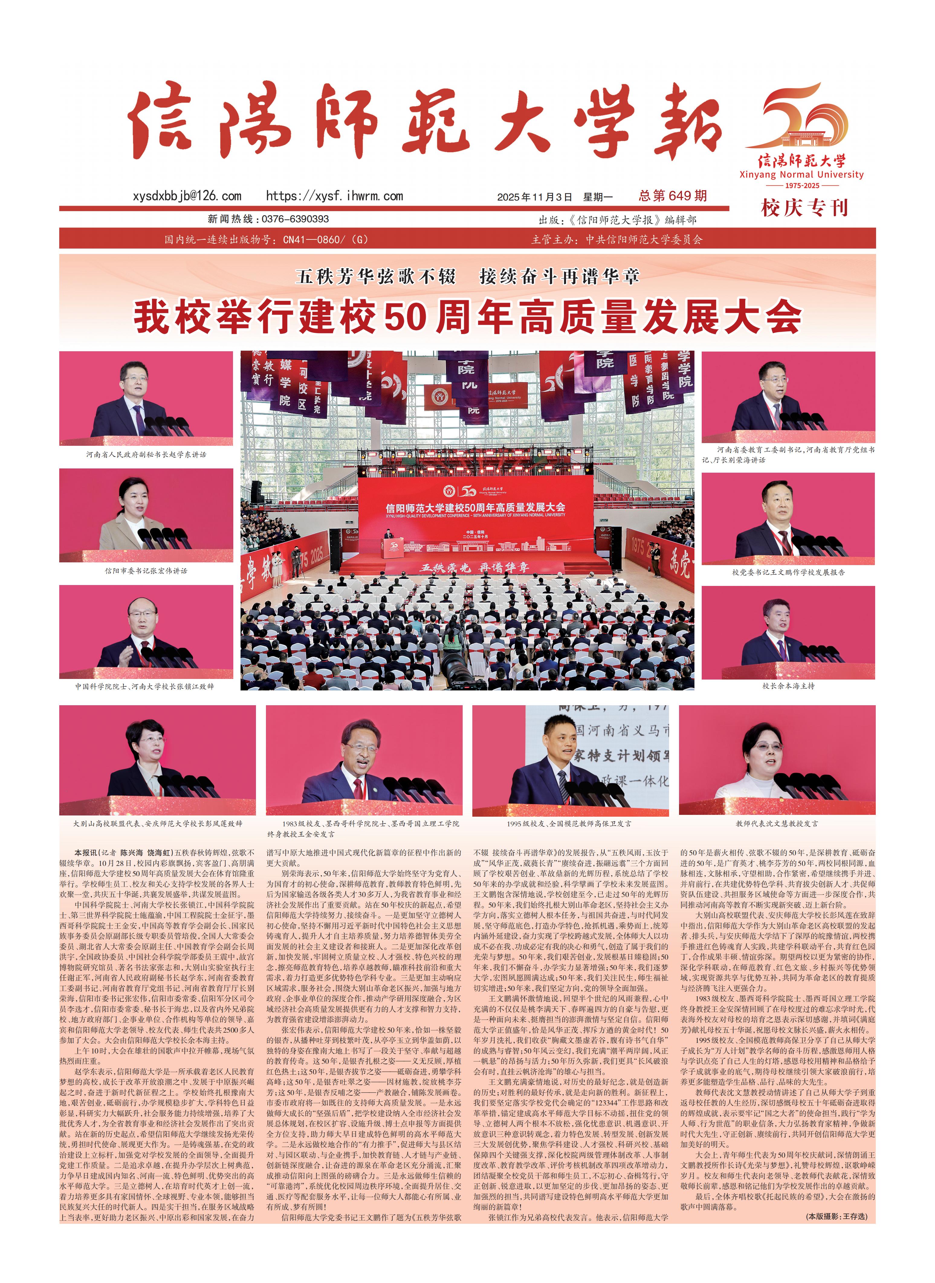 我校举行建校50周年高质量发展大会信阳师大新闻网讯 五秩春秋铸辉煌,弦歌不辍续华章。10月28日,校园内彩旗飘扬,宾客盈门、高朋满座,信阳师范大学建校50周年高质量发展大会在体育...